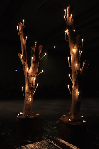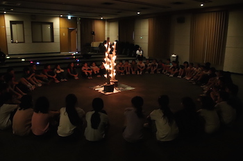 残念ながら雨が強く降ってきたので、大講義室でキャンドルファイアーでの開催となりました。火の神さまがキャンドルに点火して、キャンドルファイアーのスタートです。。