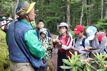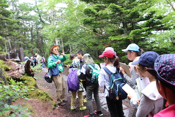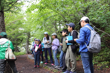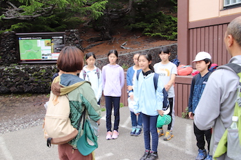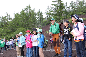 御中道では、5合目に広がるスコリアや溶岩の様子を観察し、森林限界近くの植生を解説していただきながら2時間ほどのトレッキングを行いました。
