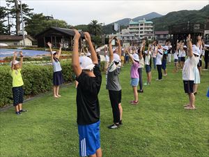 朝の散歩へ出かけ、花時計前で元気よくラジオ体操をしました。