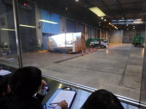 収集車がやってきて、車体の後ろを斜めにし、あっという間にごみがピットという穴に放り込まれます。そして、収集車は、どんどん次の回収に出かけていきます。子だも達が、一番感激していたのが、ごみピットのゴミを持ち上げ、ごみをかき混ぜるクレーン作業の過程です。