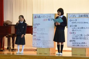 「廊下を走らないようにする取り組み」「スクールバディー活動」「お互いのよいところを見つける活動」など五つの取り組みのよかった点や課題が発表されました。