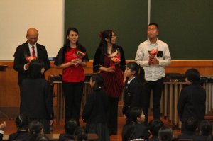 今回は、「琴音マリンバアンサンブル」の方を招いての鑑賞教室です。