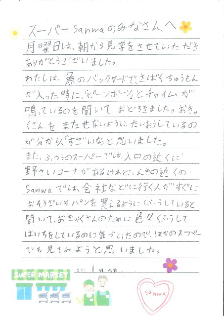 *商品が売れるように品物を前に出して工夫していることも知らなかったので勉強になりました。その日の夜、お母さんとお買い物に行きました。商品が前に出されているかを気にしながらお買い物をしたら、楽しかったです。