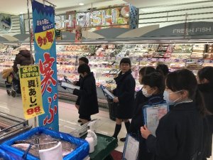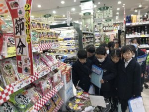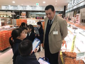 カートに山積みになっているダンボール、-25度の冷凍庫、旬の寒ブリ、この時期ならではの季節の「節分コーナー」、様々なものを見て学ぶことができました。最後に店長さんに、子どもたちの様々質問に答えていただきました。店内に並ぶ商品の種類は、なんと13000種類、商品を並べるときは、商品の「顔」が正面に無用にしていること、棚には、『ゴールデンライン』というお客さんの目線の高さの段があって、おすすめの品やお客さん手にとって欲しい新商品を並べていること、割引をする時間帯は、お客さんの流れやお天気をみてその日毎に売れ残りがなるべくでないように決めていること、などなど、たくさんの「ひみつ」を学ぶことができた有意義な見学となりました。