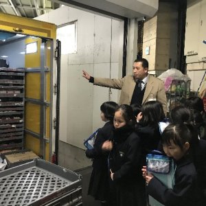 早速、子どもたちは店長さんに質問をします。「どうして、このお店は、入り口のそばにパンやお惣菜を売っているんですか?」「このお店は、駅から近いから、仕事に行く前に「お昼ご飯」だけ買いに来る人が多いんですよ。こういうお店はめずらしいですよね。」と丁寧に店長さんが答えて下さいました。次に、普段は決して見ることのできないお惣菜・魚・肉の作業場、バックヤードを見学しました。ちょうど、トラックから商品をおろしているところも見ることができました。