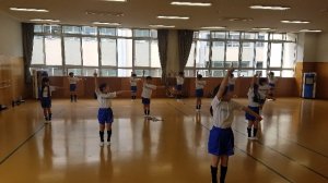 体育では、分散登校の時に練習した。体操をお互いに発表し合っていました。写真は2年生の様子。みんな、とても上手でした