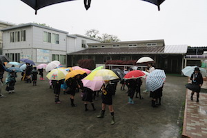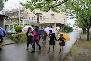 校内放送の指示に従って校庭に集合し、確認が終わったグループから出発しました。今日はあいにくの雨と強風、傘で顔が見えにくいこともあり、校庭での集合はどのグループも苦戦していました。