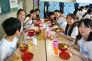 2010.05.10その他「いただきまーす」 5月10日、今日からお弁当給食がスタートです。週に2回、学園内の調理施設で調理されたお弁当の給食が全校で始まりました。この日のメニューは、鶏のたつたあげ、コーンポテト、インゲンソテー、にたまご、ミニトマトです。器は、蓋に学園のロゴと学園花であるマーガレットのイラストが入った特注の2段弁当です。まだ暖かみのあるふっくらとしたご飯やおかずは、とても好評でした。低学年では、「みんなと食べたら苦手のミニトマトが食べられたよ!」という嬉しい声も聞かれました。