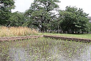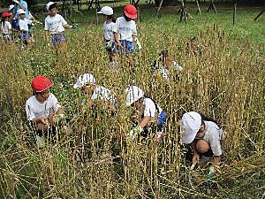 麦は、「のこぎりガマ」で刈り取ります。左手には安全のため、ゴム引きの軍手をつけ、数人ずつ順番に先生に個別指導を受けながら刈り取っていきました。