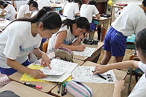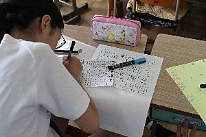 3階の教室の前を通りかかると、花の飾りを持った6年生が出てきたので中をのぞいてみました。教室の中では、新聞を書いている子ども、花を作っている子ども、分担表を作っている子どもなど、それぞれグループに分かれて作業をしています。