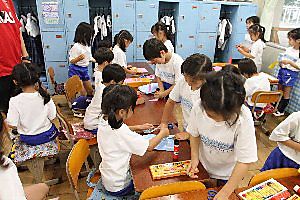 机の配置を変え、カウンターのように並べて、そのうちの何人かは、工作をしていました。これは、明日開催される「幼小なかよし交流会」の準備です。