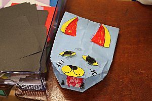 幼稚部の年長さんを自分たちのお店にお招きして、楽しんでもらおうという会です。この教室では、パクパク人形を作って幼稚部の子どもたちにプレゼントしようと準備していました。