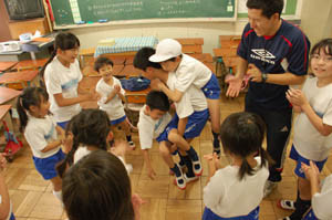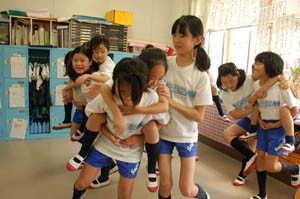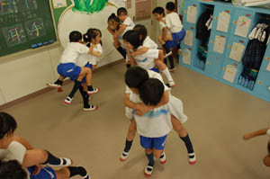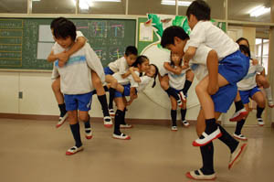 上級生が下級生をおんぶしたり、だっこしたりして何とか30秒間立ち続けようと、がんばっています。