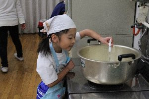 このクラスのお豆腐作りでは、出来上がった豆乳をいよいよお豆腐にする活動の真っ最中。温度計を見ながら豆乳を温めていきます。