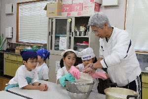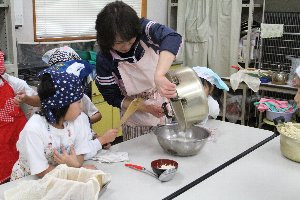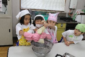 多目的教室では、子どもたちが大豆の粉末を煮立てた呉汁を、こし袋に入れてみんなで絞っていました。