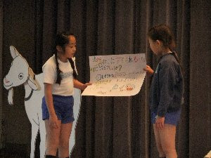 ミルクのお世話について、2年生が交代で説明してくれました。「小屋の中の掃除をする時は、ミルクの糞をこうやって集めて下さい。」