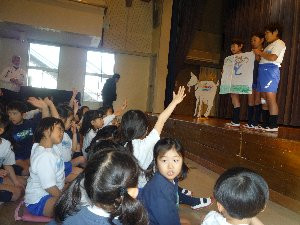 「クイズです。集めたゴミはどうすると思いますか?次の中から一つ選んで下さい。」説明の中に、クイズが入り、1年生に興味を持たせます。