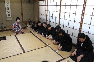 いよいよ子どもたちの番です。真(しん)のお辞儀でお茶菓子を、大学茶道部のお姉さんからいただきました。お辞儀の仕方も大切な学習です。