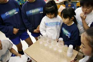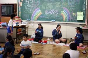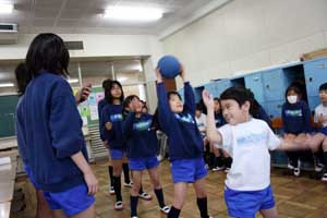 全体で6年生に感謝の気持ちを述べた後は、縦割り班対抗ゲーム大会に出発です。各会場では係の5年生が中心になって、ゲームの運営をしています。各チームとも力を合わせ、1位を目指してがんばります。
