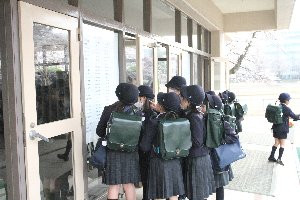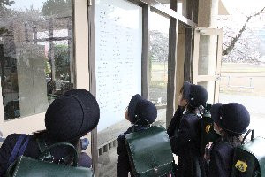 朝、登校して子どもたちが玄関で張り紙を熱心に見ています。この張り紙には、自分の新しい所属学級と、友だちの名前が印刷されているのです。「やった!」と声を上げたり、黙ってじっと見つめたり、反応は様々です。