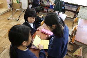 折り紙を1年生と一緒に折ってあげる6年生もいます。