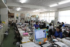 つぎは職員室を探検!「ここは先生がお仕事するお部屋です。”失礼します”と言ってから入るんですよ」職員室では、数人の先生が仕事中。手を休めて1年生の訪問を楽しんでいました。