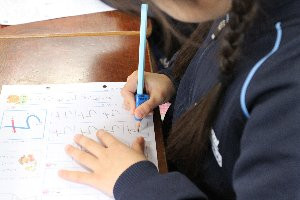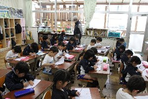 2011.04.18その他国語の授業が始まりました。1年生の教室では、国語の授業が始まっています。全員でひらがなの練習をしています。ひらがなの学習だけでなく、鉛筆を正しく握る練習も兼ねています。鉛筆に「はなまるくん」をセットすると、指の位置が自然に決まります。子どもたちにとってこの指の位置が定着するのは簡単ではありません。お箸の持ち方と共通する点がありますので、繰り返し家庭で、あきらめずにていねいに教える必要があります。ひらがなの形を覚え、書ける事と同時に、鉛筆の先に伝わる力をコントロールする手の動きもこの時期の大切な学習です。