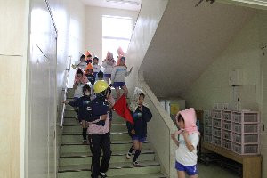 「押さない」「駆けない」「しゃべらない」といった基本を子どもたちに伝え、実際の場面でもパニックに陥らず行動出来るように練習します。