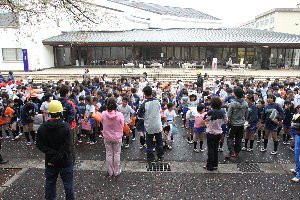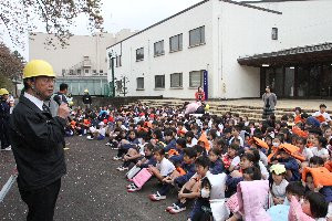 校舎外に集合した子どもたちに「今日は、真剣さが足りません!」「練習だと思って油断していませんか?」校長先生から厳しい講評がありました。