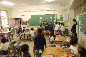数人ずつのグループに分かれ、1年生から5年生までの各クラスで、説明をしました。