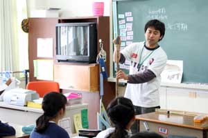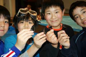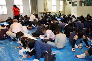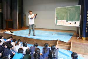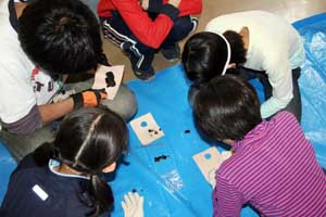 教室での授業を終え、ホールに移動。いよいよ石器づくりに挑戦です。
