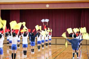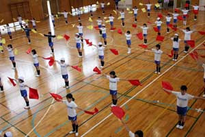 運動会までの2週間は、毎日、全校遊戯の練習があります。今年の全校遊技は、子どもたちが2本の旗をもって踊る「旗体操」です。