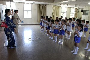 先生お二人は、日本舞踊らしく和服姿です。授業はまず、お辞儀の仕方から始まりました。