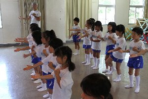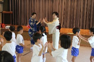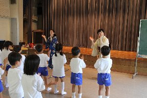 「むすんでひらいて」の歌には、歌詞に合わせて簡単な動作がつけられていますが、授業では、日本舞踊の動きを盛り込んだ動作になっています。