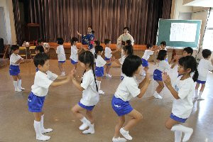 子どもたちもだんだん動きを覚えてきました。くるりと向きを変えて後ろの友だちと同じ動作を繰り返します。