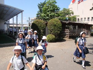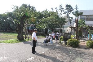 本日の下校は、集団下校班による集団下校です。災害時など、一斉下校を想定して同じ方面に下校する子どもたちでグループを編成しています。