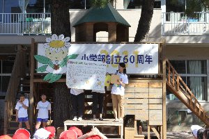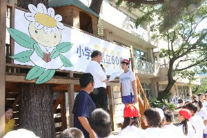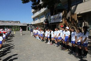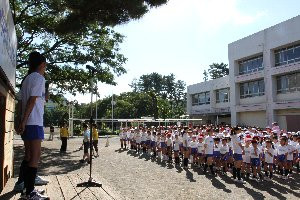 朝8時30分、全校児童が集合し、朝会が始まりました。朝日にはまだまだ夏の暑さが残っています。