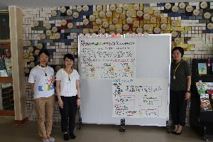 朝会の後、EKS48の学生スタッフ3人がスペシャルランチコンテストのポスターを展示しました。ポスターには、6年1組から3組までのエントリーランチ3案が、くわしく紹介されています。