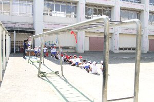 全長が15メートル、ステップは50あります。今日は1年生が体育の授業としてこの「うんてい」に挑戦しました。
