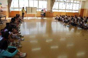 まず、トレーニングルームで歓迎会が行われました。小学部の子どもたちは、「エーデルワイス」や「となりのトトロ」の曲で歓迎。