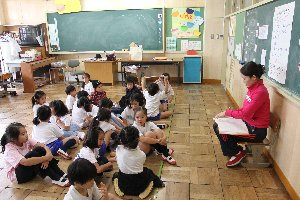 1年生のこのクラスでは、机を移動して教室内に空間を作り、これから劇の練習を始めるところでした。