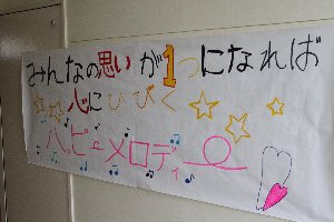 廊下には、パレードにかける6年生の思いが込められたメッセージが、大きな模造紙に書かれて掲げられています。「みんなの思いが一つになれば心に響くハッピーメロディ!」