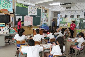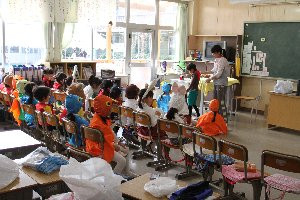 1年生の教室では、子どもたちが劇の衣装を身につけ、最後の練習を一生懸命していました。
