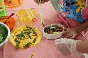 教室の後方に用意された食材を、自分に合ったサイズのお弁当箱に、設計図をもとに自分で詰めていきます。組み合わせや彩り、並べ方などひとり一人工夫しながら楽しそうに詰めていました。