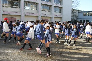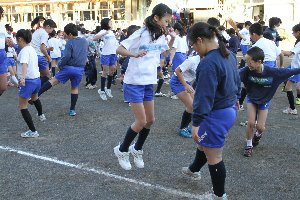 「あんたがさどこさ」の歌に合わせて動作をしてもらいます。「さ」の言葉の時にしゃがむ、跳ぶを交互にして下さい」430人の子どもたちが歌に合わせてしゃがんだり跳び上がったり。