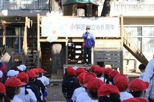 今日は月曜日、全校朝会の日です。今日の朝会は「体育朝会」、校長先生のお話の後、体育の先生が朝礼台に上がりました。
