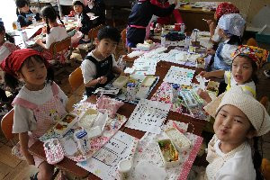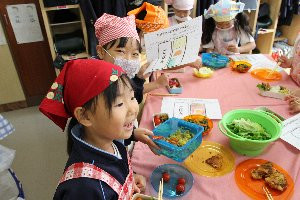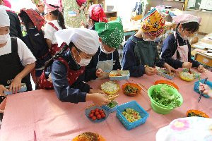4校時、1年生の教室では食育の授業が行われました。先日、じぶんにぴったりなお弁当について学習し、今日は実際に容器に詰める活動です。お箸の扱いに苦戦している子どももいましたが、みんなお弁当を詰めることができました。