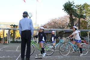 自転車の安全な乗り方、道路や交差点での注意など、実際の自転車を使った学習会です。校庭に信号機を設置し、ひとり一人実際に自転車を走らせて、市の生活安全課の先生から指導していただきました。