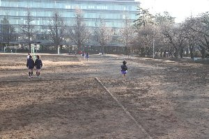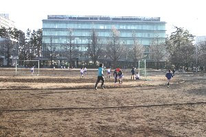 寒さのため、大グラウンドの土は、朝のうち固く凍てついています。日が昇ると表面が溶け、あまり良いコンディションとは言えません。