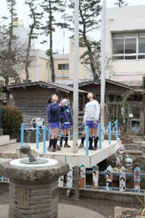 国旗掲揚塔では、部旗や国旗の掲揚方法について、説明をしていました。